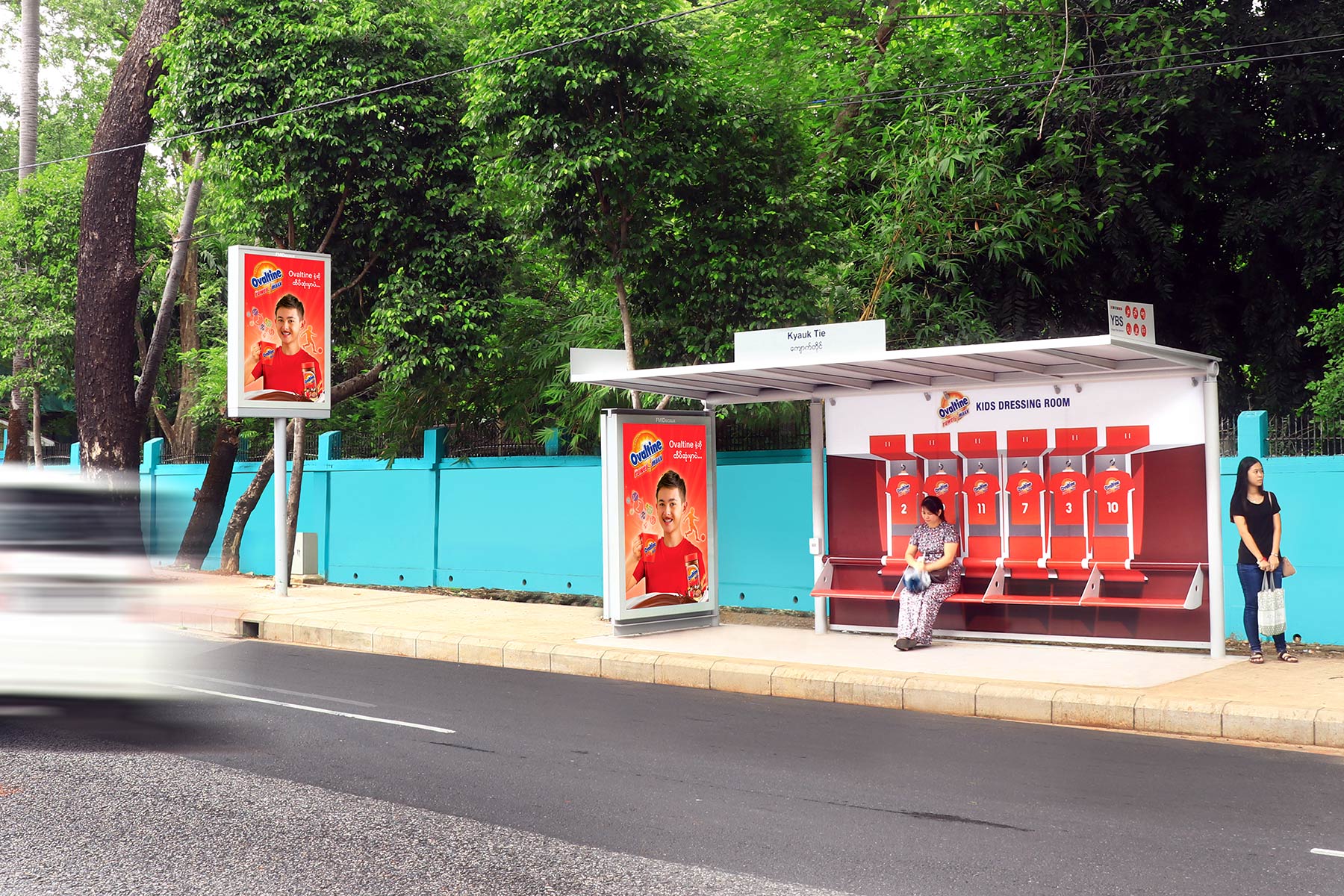 For the first time in Myanmar, Ovaltine teamed up with FMIDecaux in collaboration with Coca Media to immerse passers-by and bus passengers either into a Kids' dressing room or into a Kids' Playrgound.